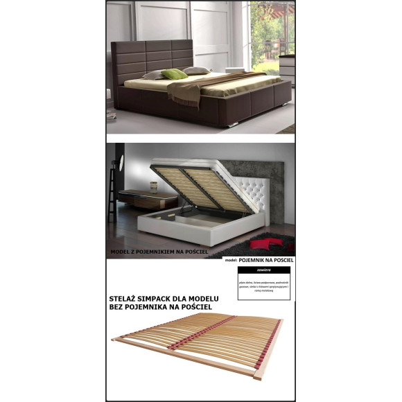 Podstawowa cena łóżka dotyczy samej skrzyni, wraz z zagłówkiem. W opcjach możliwość domówienia stelaża, lub w wersji z pojemnikiem na pościel stelaża na ramie metalowej na podnośnikach gazowych.